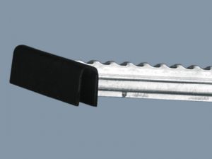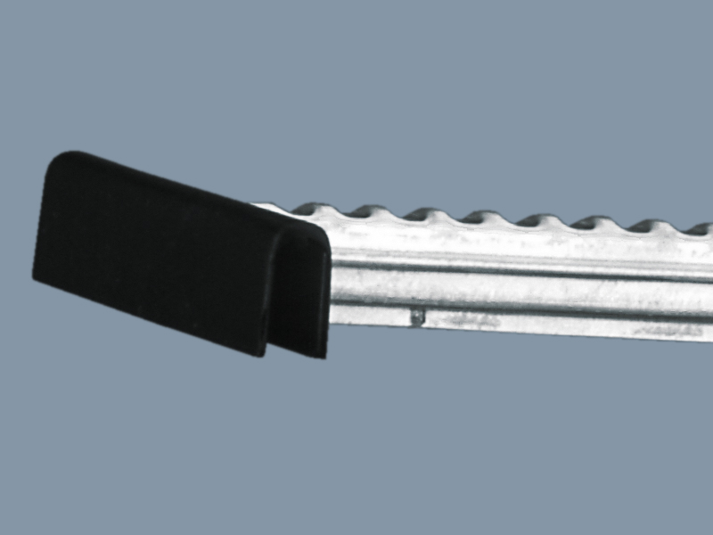 Supporto ondulato in metallo zincato con laterali in plastica antiurto, questa soluzione evita che il gancio scorra lungo la barra senza tuttavia essere bloccato.
