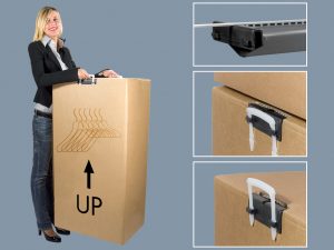 Veloce nel montaggio e pratico nell’uso. Studiato con un sistema di aggancio scorrevole a scomparsa per dar modo di sovrapporrre i bauli senza capovolgerli e di movimentarli dai camion senza grossi sbalzi ( causa principale delle rotture dei bauletti ).